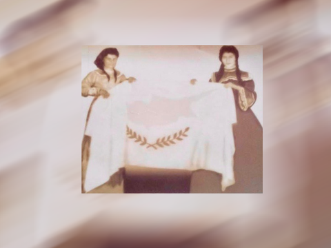 Όταν έγινε η φωτογράφηση αυτή ήμουνα 13 χρόνων. Το μόνο που θυμάμαι είναι τον μακαρίτη τον πατέρα μου να μου λέει «θέλω να βάλεις τη κυπριακή σου τη στολή και να βγάλουμε μια φωτογραφία. Θα κάνεις ότι κεντάς τη σημαία». Όταν, όμως, το δοκιμάσαμε, δεν φαινότανε ολόκληρη η σημαία, οπότε φώναξα μια φίλη γειτονοπούλα και βγάλαμε τη φωτογραφία μαζί.