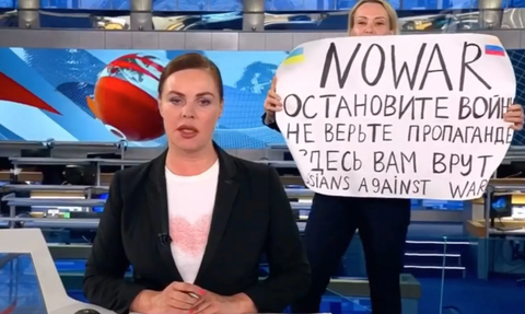 Η γυναίκα που εμφανίσθηκε κατά τη διάρκεια του τηλεοπτικού δελτίου του προσκείμενου στο Κρεμλίνο Pervy Kanal (1ο Κανάλι) πίσω από την τηλεπαρουσιάστρια, κρατώντας ένα πλακάτ που έγραφε «Όχι στον Πόλεμο. Μην πιστεύετε την προπαγάνδα. Εδώ, σας λένε ψέματα», κινδυνεύει με ποινή κάθειρξης έως και 15 ετών.