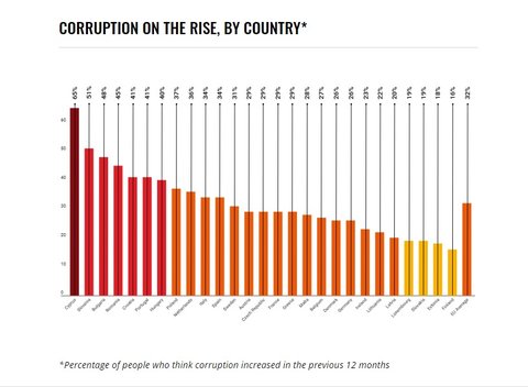 Σε ερώτηση κατά πόσο το επίπεδο διαφθοράς στη χώρα έχει αυξηθεί, παραμείνει το ίδιο ή μειωθεί τα τελευταία τρία χρόνια, 66% των ερωτηθέντων στην Κύπρο απάντησαν πως έχει αυξηθεί (41% στην ΕΕ), 27% πως έχει παραμείνει το ίδιο (43% στην ΕΕ) και 4% πως έχει μειωθεί (9% στην ΕΕ).