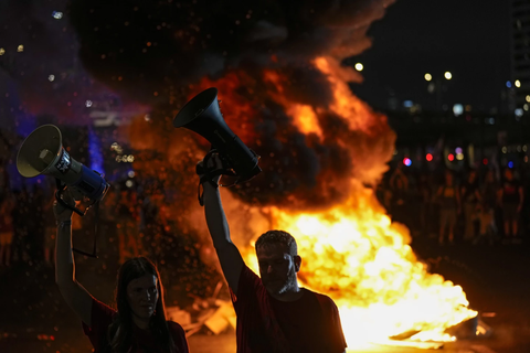 Στο Τελ Αβίβ, διαδηλωτές που εναντιώνονται στην κυβέρνηση του Νετανιάχου διαδήλωσαν χθες, για ακόμη μια φορά, απαιτώντας να κλειστεί συμφωνία κατάπαυσης του πυρός, που θα επιτρέψει την επιστροφή των ομήρων που παραμένουν ζωντανοί.